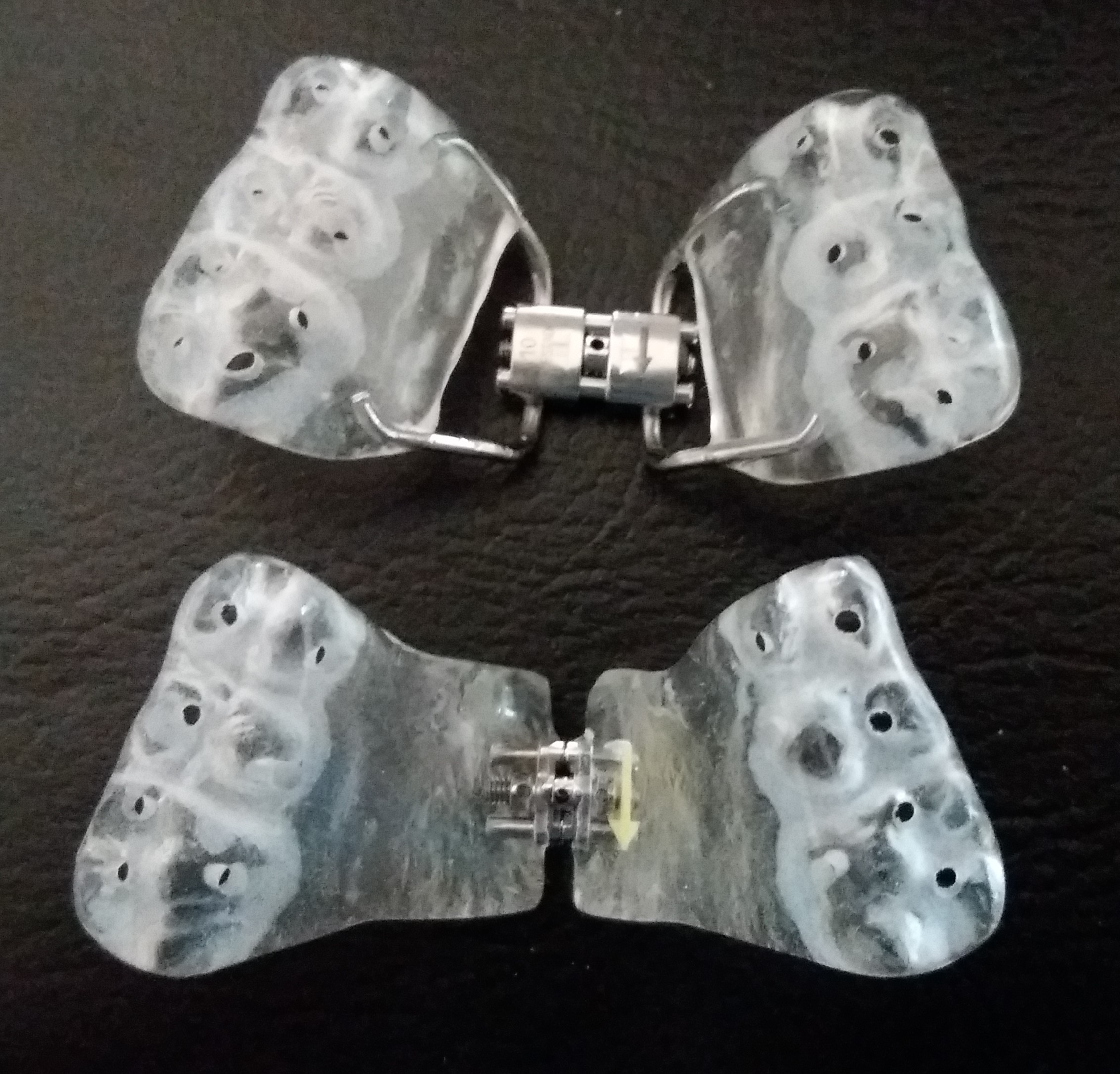 Drahtgeräte / modifizierte (gebondete) GNE Die modifizierte (gebondete) GNE entspricht in der Handhabung, Indikation und Tragedauer der konventionellen GNE. Sie hat seitliche Kunststoffaufbisse, die mit einer Hyrax-Schraube oder einer transversalen Dehnschraube verbunden sind. Sie wird ebenfalls einzementiert. modifizierte (gebondete) GNE Bild 1 von 1